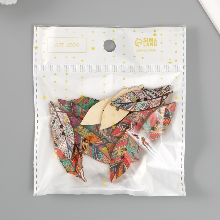 Пуговица дерево для творчества 2 прокола "Пёрышки с узорами" набор 16 шт МИКС 4,2х1,4х0,2 см