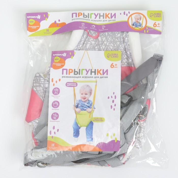 Посадите полугодовалого кроху в сиденье-штанишки. Малышу понравится активная игра, он будет подпрыгивать и качаться. Размер посадочного места можно настроить индивидуально, а за перекладину ребёнку будет удобно держаться.