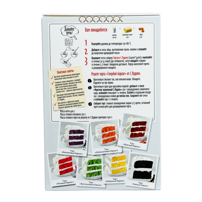 При создании торта «Голубой бархат» мы вдохновлялись передовыми современными трендами в мировом кондитерском искусстве. Торт красивого изысканного цвета с пористыми бисквитами, буквально тающими во рту, словно бы сделан в дорогой кондитерской. Ваши близкие и гости обязательно так подумают, когда его увидят на столе. При этом приготовить выпечку с гарантированным результатом сможет каждая хозяйка. Мы высчитали все пропорции ингредиентов, вам останется только объединить их, выложить готовое тесто в форму и испечь, согласно инструкции. Украсьте готовый торт ванильным фростингом от «С.Пудовъ» или своим любимым кремом.