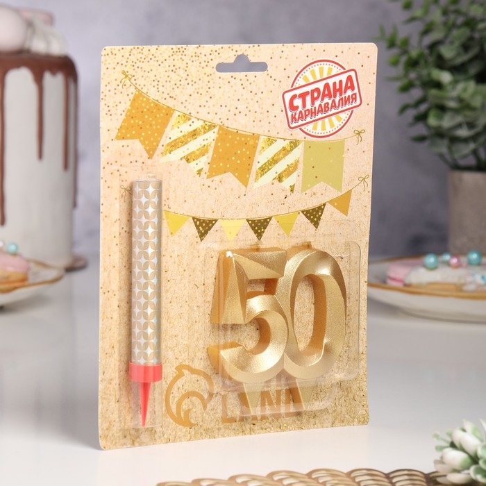Свеча в торт юбилейная "Грань + фонтан", цифра 50, золотой металлик, 6,5 см