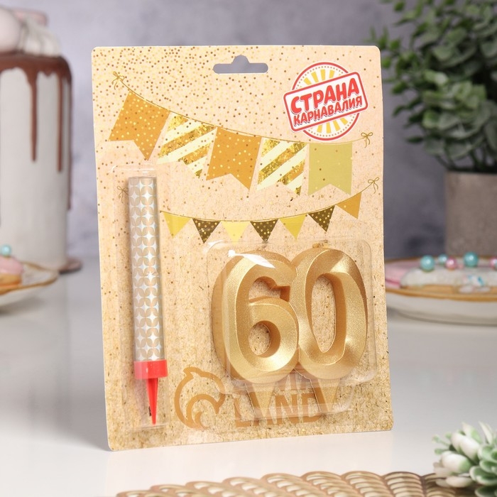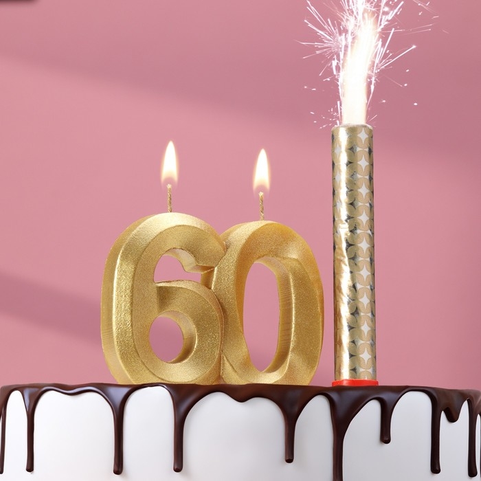 Свеча в торт юбилейная "Грань + фонтан", цифра 60, золотой металлик, 6,5 см