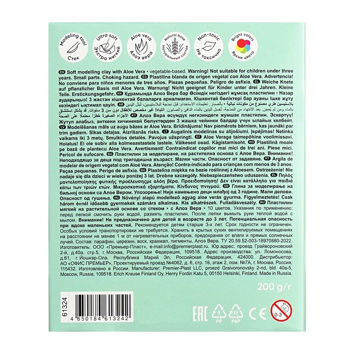 Мягкий пластилин на растительной основе ErichKrause с Алоэ Вера изготовлен на восковой основе, с добавлением натурального кукурузного крахмала, имеет мягкую консистенцию и особую пластичность, создан специально для дошкольников. Вазелиновое масло, которое широко используется в детской косметологии и экстракт Алоэ Вера во время лепки заботятся о комфорте детских рук. Мягкий пластилин отличный инструмент для развития мелкой моторики. Масса легко разминается и не застывает на воздухе, а также не прилипает к рукам и не пачкает одежду. Улучшенная цветовая палитра содержит яркие насыщенные цвета, которые отлично смешиваются между собой, создавая новые оттенки. Пластичная структура позволяет использовать мягкий пластилин в технике рисования пластилином. Каждый брусок имеет индивидуальную упаковку «flow-pack», которая надежно сохраняет товарный вид и пластичные свойства продукта.