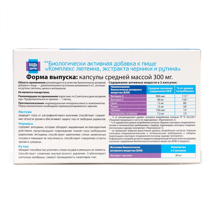 Комплекс Лютеина, экстракт черники и рутина "Будь Здоров!", 30 таблеток