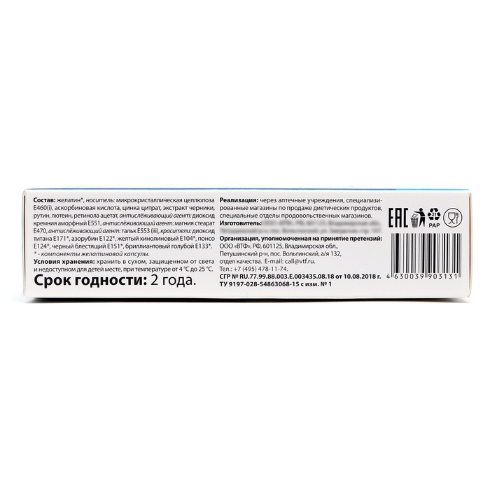желатин; носитель: микрокристаллическая целлюлоза Е460 (i); аскорбиновая кислота, цинка цитрат, экстракт черники, рутин, лютеин, ретинола ацетат; антислёживающий агент: диоксид кремния аморфный Е551; антислёживающий агент: магния стеарат Е470; антислёживающий агент: тальк Е553 (iii); красители: диоксид титана Е171, азорубин Е122 , желтый хинолиновый Е104, понсо Е124, черный блестящий Е151, бриллиантовый голубой Е133, компоненты желатиновой капсулы.
