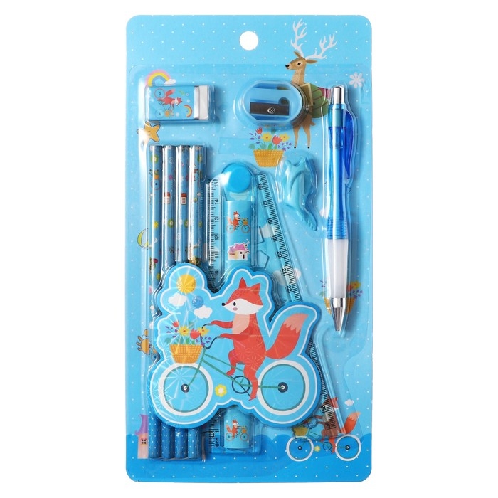 Набор канцелярский Calligrata 9 предметов, 4 чернографитных карандаша, точилка, ластик, линейка, ручка, насадка-тренажер, голубой