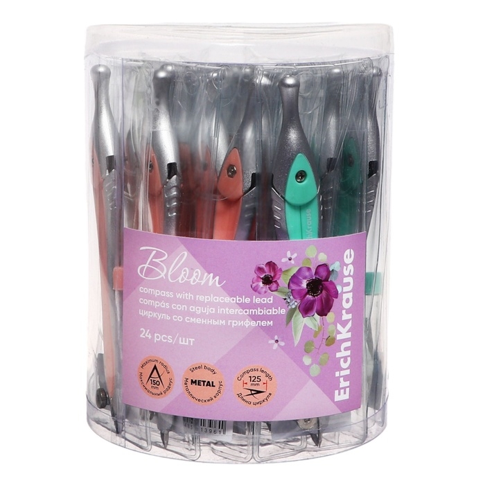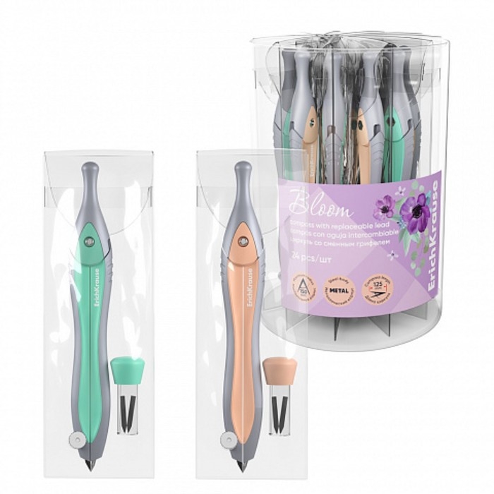 Циркуль металлический ErichKrause "Pastel Bloom", 125мм, со сменным грифелем, PVC чехол, микс