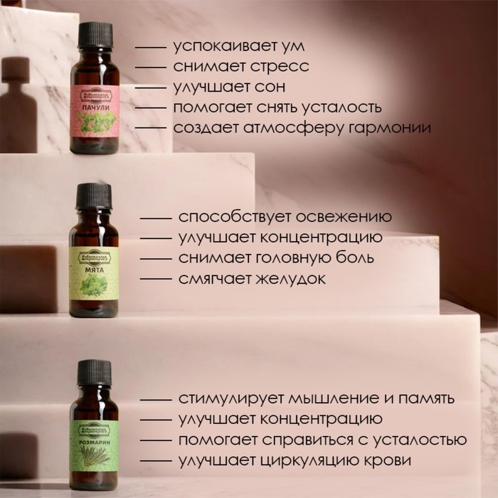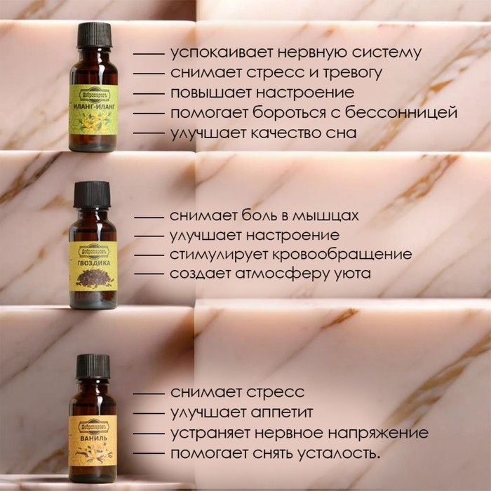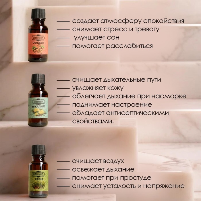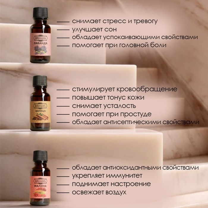 Ваниль, Гвоздика, Иланг-иланг, Корица, Лаванда, Малина, Мята, Пачули, Розмарин, Сандал, Сосна, Эвкалипт