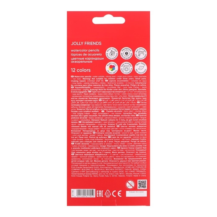 Карандаши акварельные 12 цветов ErichKrause "Jolly Friends", дерево, шестигранные с кисточкой, европодвес