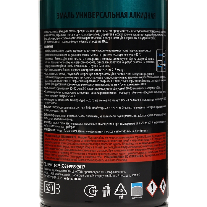 Эмаль KUDO с технологией «3P» - это высококачественная универсальная алкидная аэрозольная краска, специально разработанная для окрашивания предварительно загрунтованных металлических и деревянных поверхностей. Эта краска обеспечивает долговечное покрытие с отличной укрывистостью, атмосферостойкостью и превосходной адгезией к окрашиваемой поверхности. Имеет высокую твердость, светостойкость и стойкость к растворителям. Применяется для наружных и внутренних работ, и легко наносится на труднодоступные места.