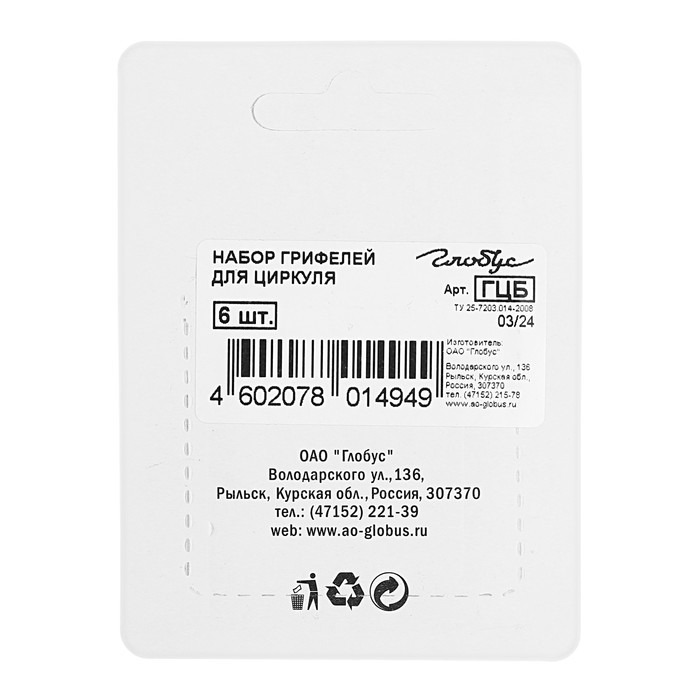 Набор грифелей для циркулей GLOBUS, 6 штук, 22мм, 2 тубы, в блистере