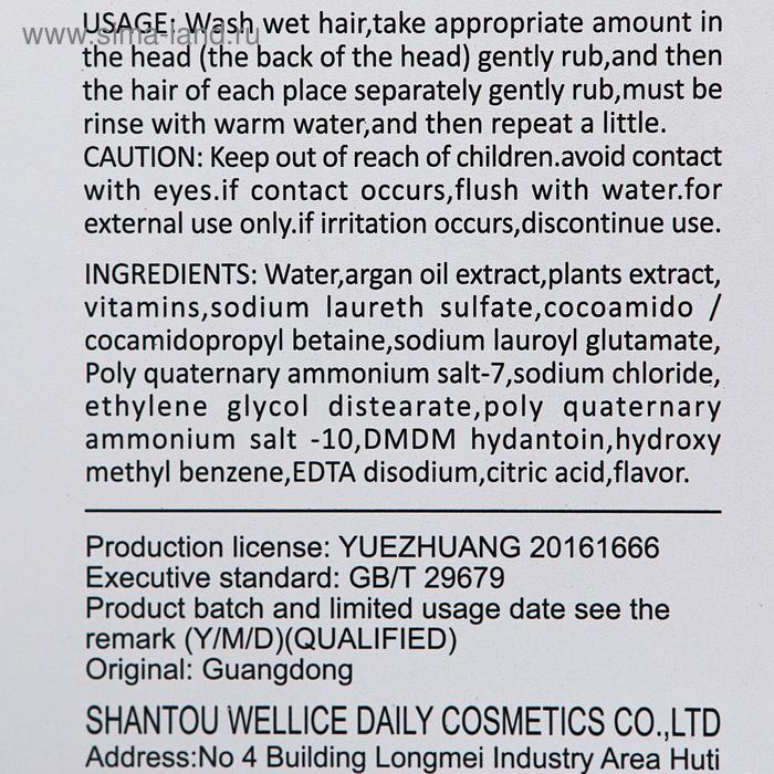 Состав: Water, Argania Spinosa, Plants Extract, Vitamins, Sodium Laureth Sulfate, Cocamidopropyl Betaine, Sodium Lauroyl Glutamate, Poly Quaternary Ammonium Salt-7, Sodium Chloride, Glycol Distearate, Poly Quaternary Ammonium Salt -10, DMDM Hydantoin, Hydroxy Methyl Benzene, Disodium EDTA, Citric Acid, Parfum.