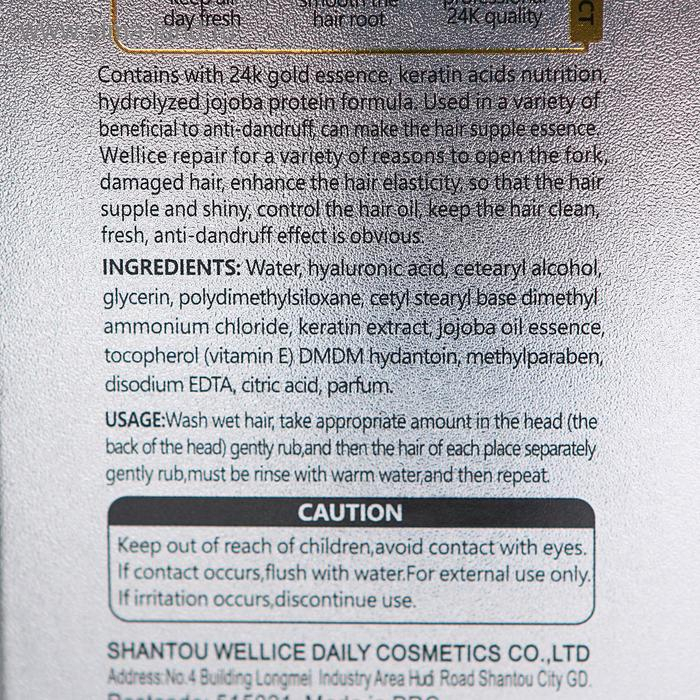 Состав: Water, Hyaluronic Acid, Keratin Extract, Jojoba Oil Essence, Tocopheryl Acetate, Protein Essence, Cetearyl Alcohol, Glycerin, Polydimethylsiloxane, Cetyl Stearyl Base Dimethy Ammonium Chloride, DMDM Hydantoin, Methylparaben, Disodium EDTA, Citric Acid, Parfum.