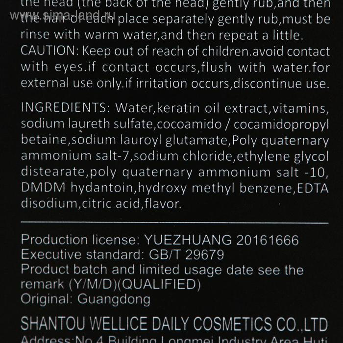 Состав: Water, Keratin Oil Extract, Vitamins, Sodium Laureth Sulfate, Cocoamido / Cocamidopropyl Betaine, Sodium Lauroyl Glutamate, Poly Quaternary Ammonium Salt-7, Sodium Chloride, Ethylene Glycol Distearate, Poly Quaternary Ammonium Salt -10, DMDM Hydantoin, Hydroxy Methyl Benzene, EDTA Disodium, Citric Acid, Flavor.