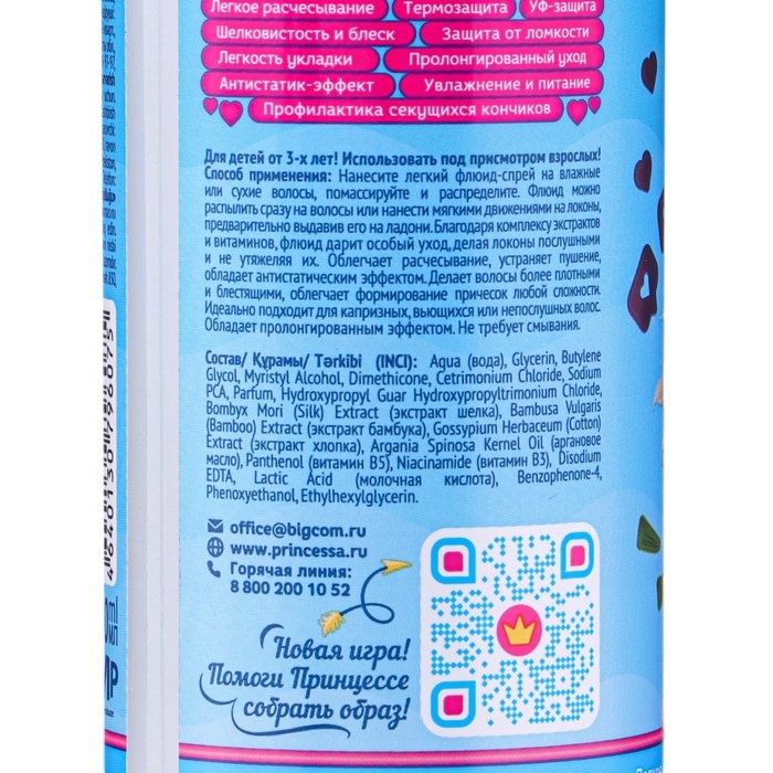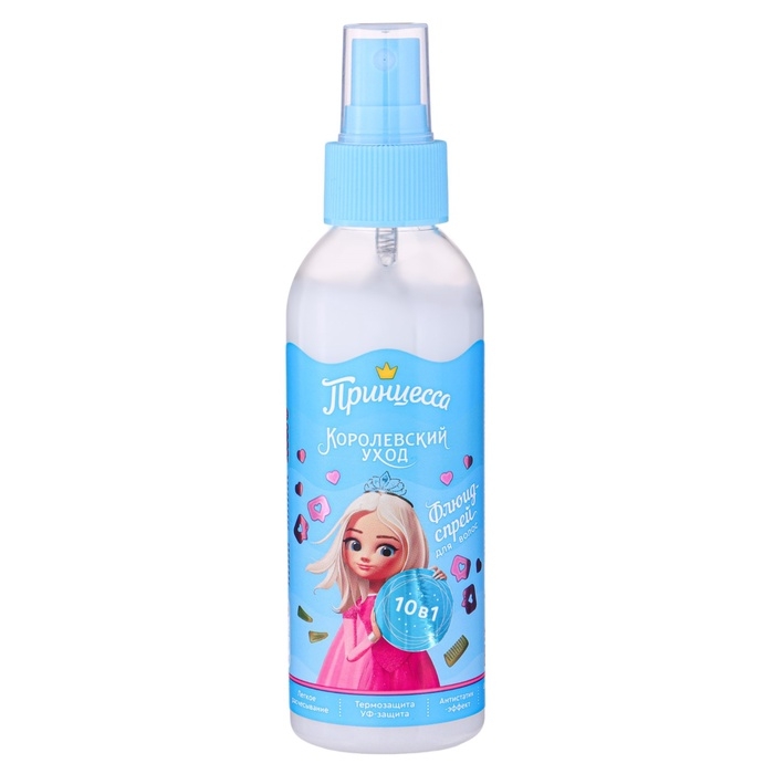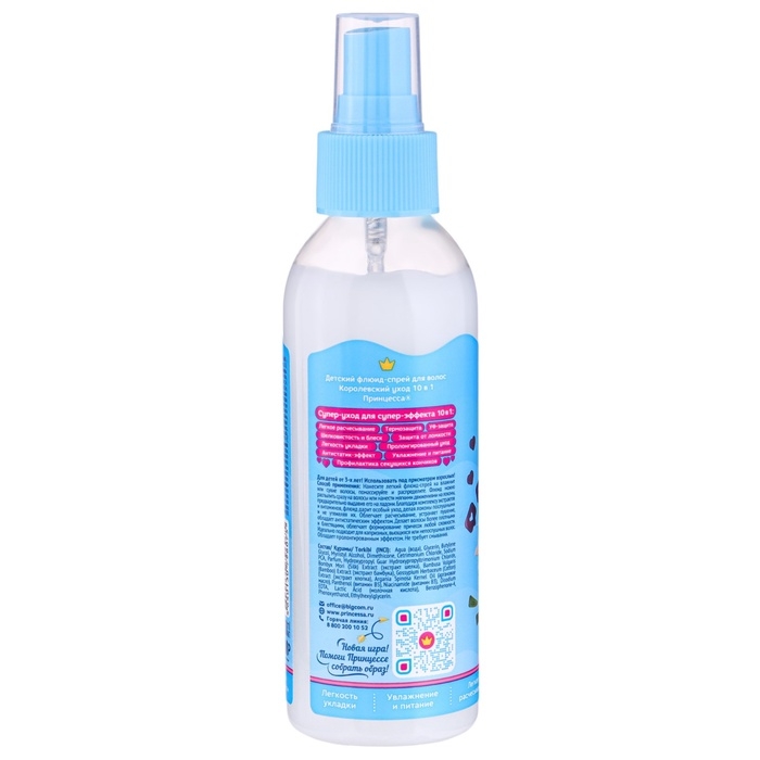 Принцесса для настоящих принцесс! Уникальный флюид-спрей Королевский уход 10 в 1 создан специально для девочек, волосы которых нуждаются в особом уходе. Это решение нескольких проблем в одном продукте: флюид подходит для всех типов волос, включая поврежденные волосы, непослушные волосы с пористой структурой, тонкие, ломкие и сухие волосы. Флюид-спрей Принцесса восстанавливает волосы, избавляет от секущихся кончиков, убирает эффект одуванчика из-за статического электричества. Спрей для волос питает и укрепляет волосы, делает их плотными и блестящими. Благодаря легкой кремовой текстуре флюид легко распределяется по волосам, не утяжеляя их.