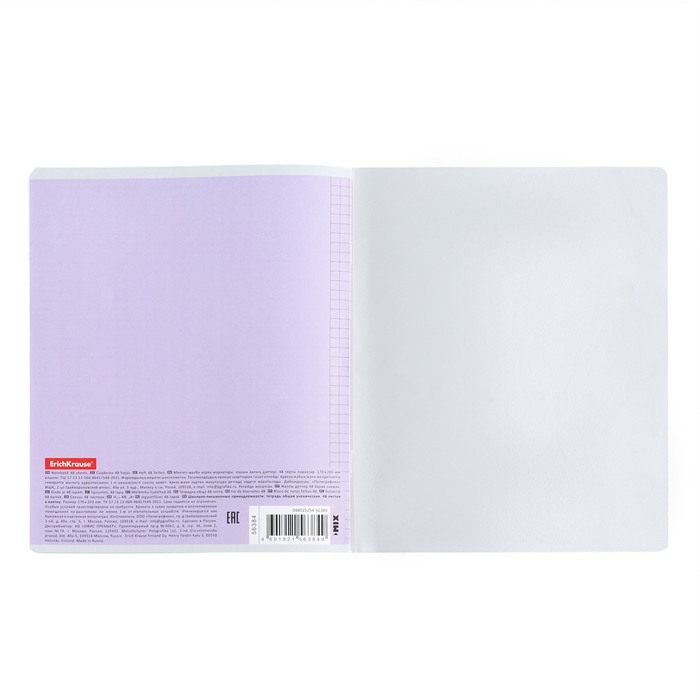 Тетрадь общая ученическая формата А5+ (170x203 мм). Двойная обложка: внешняя выполнена из высококачественного износостойкого прозрачного пластика с фактурой «апельсиновая корка», внутренняя — из качественной мелованной бумаги. В блоке 48 листов в клетку. Бумага офсетная плотностью 60 г/м2. Цвет линовки — синий. Скругленные уголки обложки и блока. Тип скрепления — скоба. Тетради разных дизайнов упакованы в термоусадочную пленку по 5 штук.