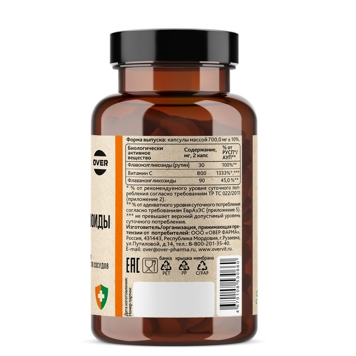 Состав: Аскорбиновая кислота (Витамин С), экстракт померанца, стандартизованный по флаванонгликозидам (Citrus aurantium L.), наполнитель - микрокристаллическая целлюлоза , желатиновая капсула (желатин, вода, краситель - диоксид титана), экстракт софоры (Sophora japonica L.), агенты антислеживающие: магниевая соль стеариновой кислоты, диоксид кремния аморфный.