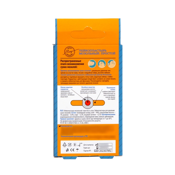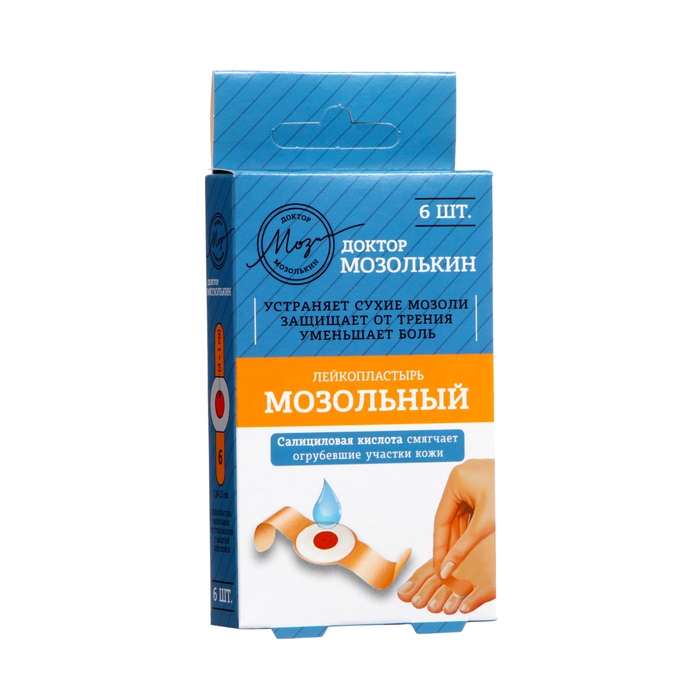 Лейкопластырь содержит салициловую кислоту, которая размягчает верхние слои мозоли, облегчая её удаление. «Доктор Мозолькин» легко и безболезненно удаляется, не оставляя следов на коже.