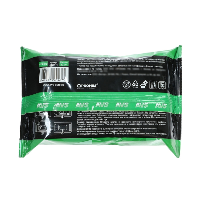 Влажные салфетки «Для салона» AVS AVK-212 поставляются в упаковке с пластиковым клапаном и содержат 60 штук. Эти салфетки предназначены для очистки и освежения пластиковых и кожаных поверхностей в салоне автомобиля. Они эффективно удаляют загрязнения благодаря специальной пропитке, не оставляя жирных следов и разводов. После использования салфетки создают защитную плёнку с антистатическими свойствами, предотвращая выцветание панелей. Салфетки обладают приятным ароматом и нейтрализуют неприятные запахи, включая запах табака. Они могут использоваться как в автомобиле, так и в быту. Пропитывающий состав безопасен для кожи рук.