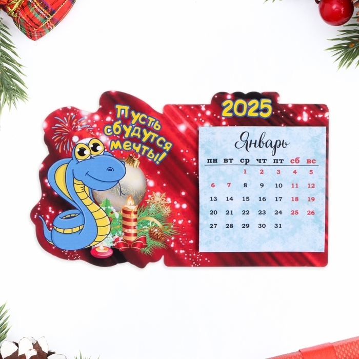 Магнит новогодний, змея, с календарем "Пусть сбудутся мечты!" символ года, свеча