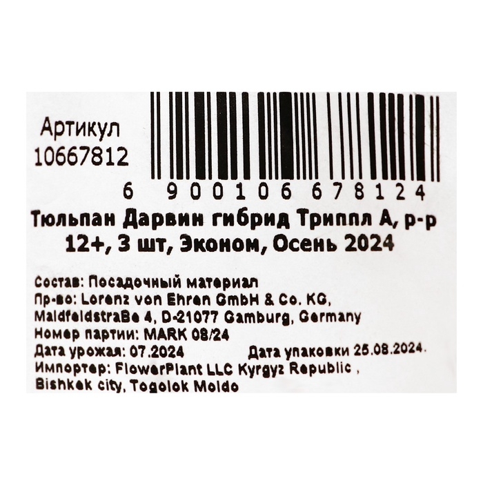 Тюльпан Дарвин гибрид Триппл А, р-р 12+, 3 шт, Эконом, Осень 2024