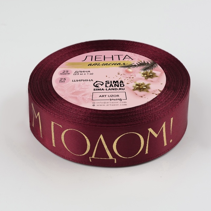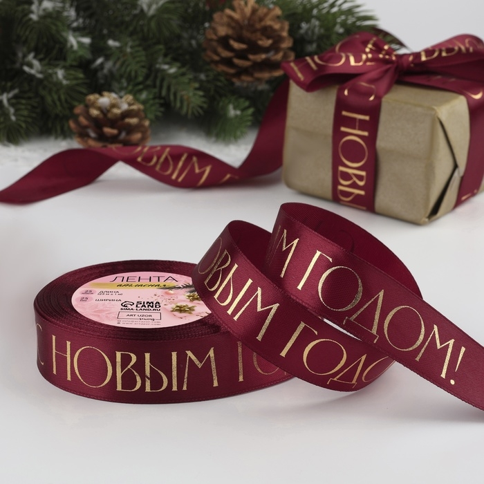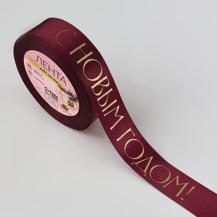 Лента атласная с тиснением «С Новым годом», 25 мм, 23 ± 1 м, цвет бордовый