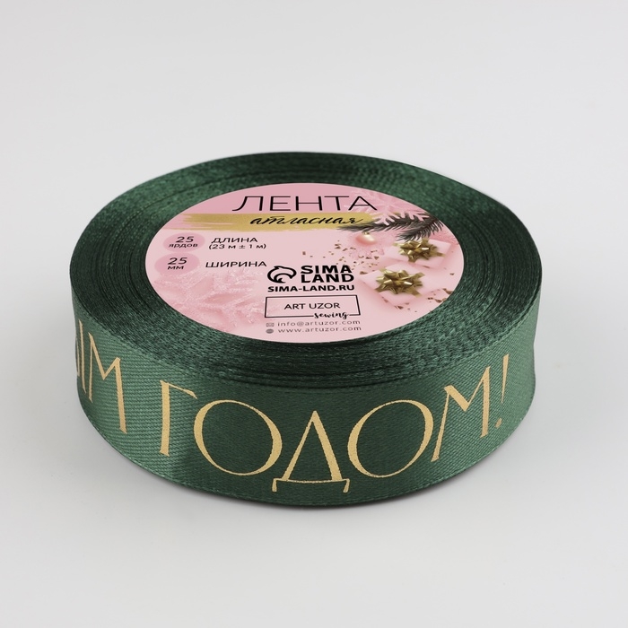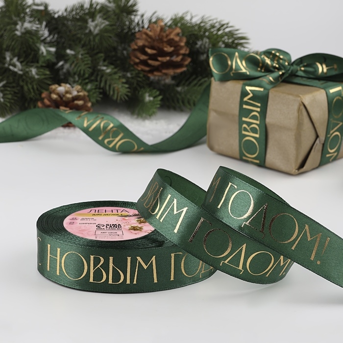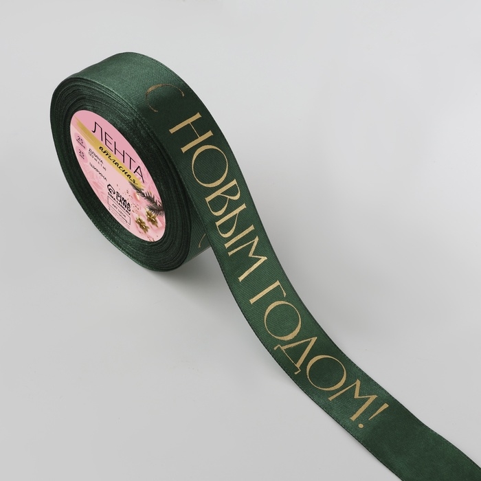 Лента атласная с тиснением «С Новым годом», 25 мм, 23 ± 1 м, цвет тёмно-зелёный