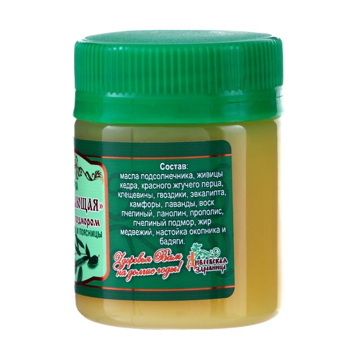 Состав: масло подсолнечника, воск пчелиный, пчелиный подмор, прополис, живица кедровая, масло гвоздичное, масло камфорное, масло эвкалиптовое, масло пихтовое, масло эфирное лавандовое, жир медвежий, экстракт окопника, бодяги, масло красного перца.