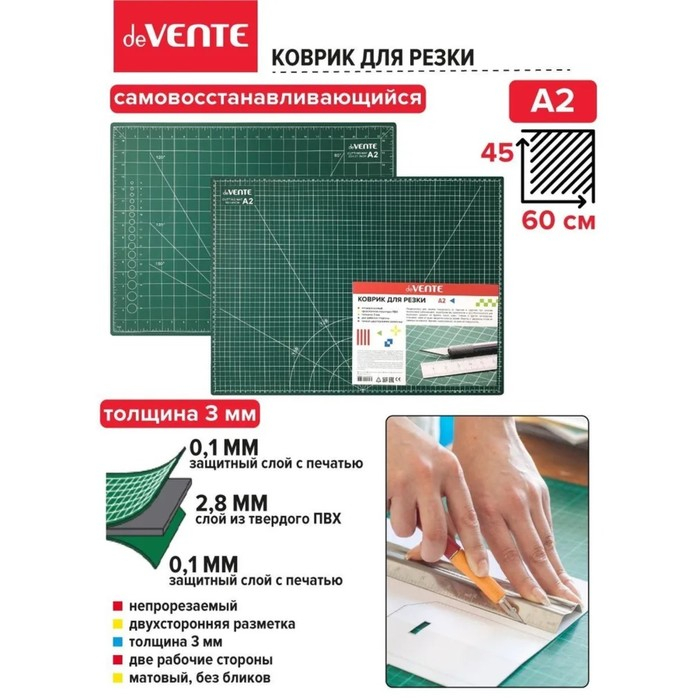 Коврик для резки макетный A2 deVENTE, 3 мм, непрорезаемый, двусторонний, трёхслойный