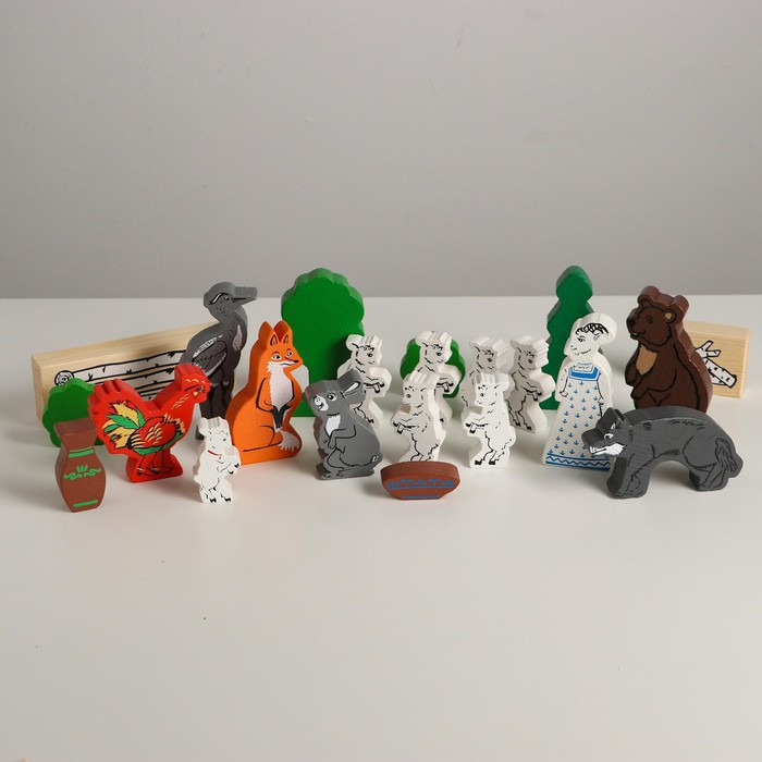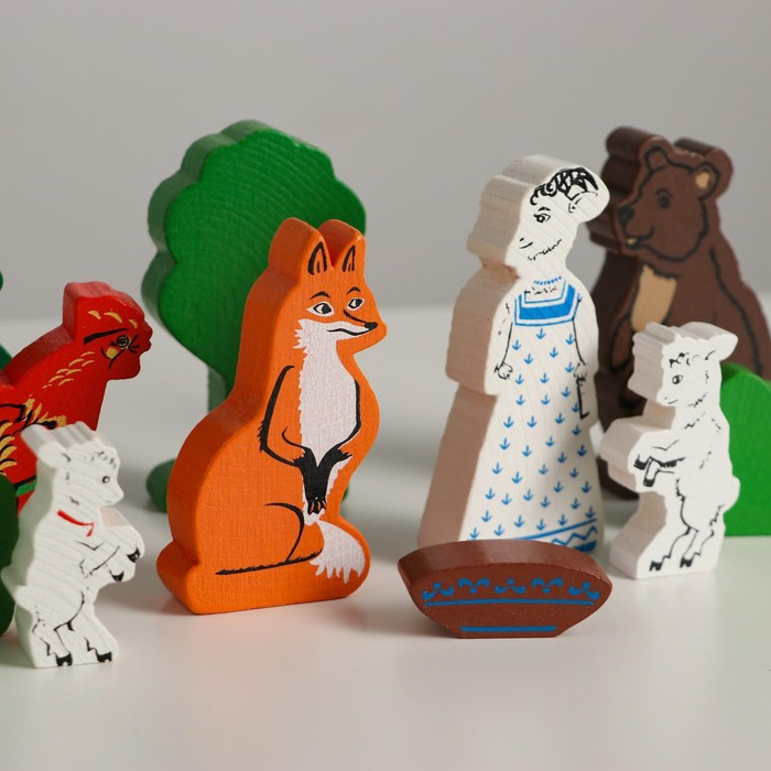 - В наборе 3 сказки: «Лиса и журавль», «Заюшкина избушка» и «Волк и семеро козлят».