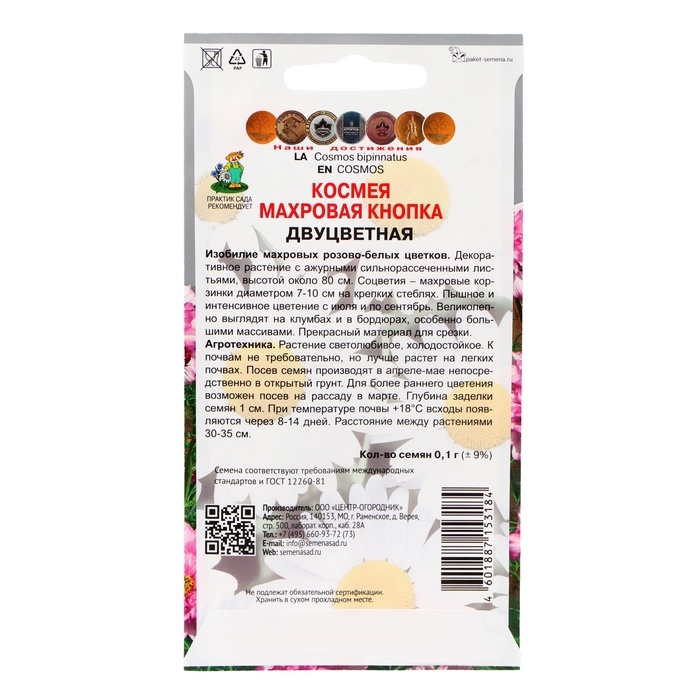 Изобилие махровых розовов-белых цветков. Декоративное растение с ажурными сильнорассеченными листьями, высотой около 80 см. Соцветия – махровые корзинки диаметром 7-10 см на крепких стеблях. Великолепно выглядят на клумбах и в бордюрах, особенно большими массивами. Прекрасный материал для срезки.Агротехника. Растение светолюбивое, холодостойкое. К почвам не требовательно, но лучше растет на легких почвах. Посев семян производят в апреле-мае непосредственно в открытый грунт. Для более раннего цветения возможен посев на рассаду в марте. Глубина заделки семян 1 см. При температуре почвы +18°C всходы появляются через 8-14 дней. Расстояние между растениями 30-35 см.Семена соответствуют требованиям международных стандартов и ГОСТу РФ 12260-81