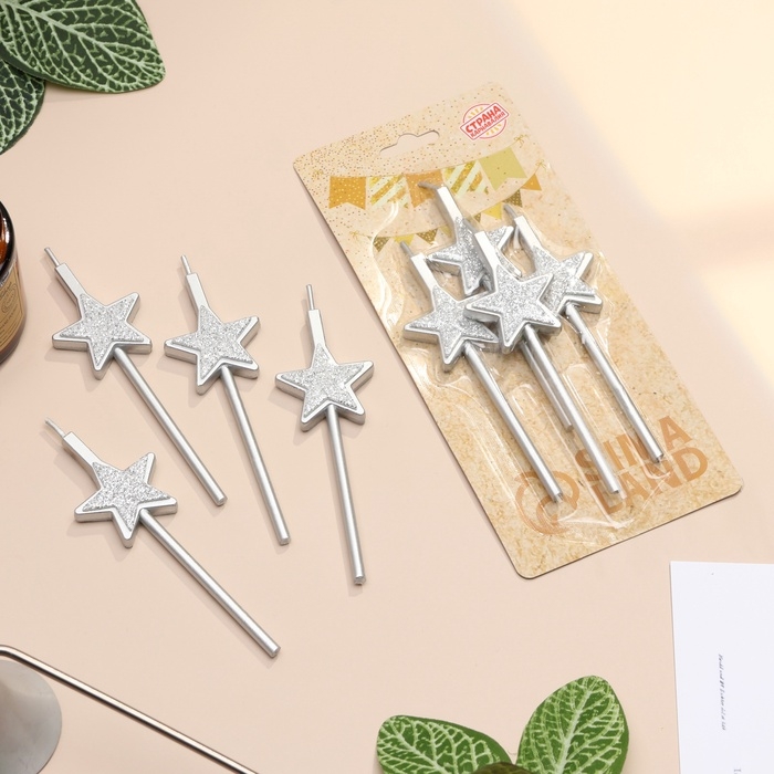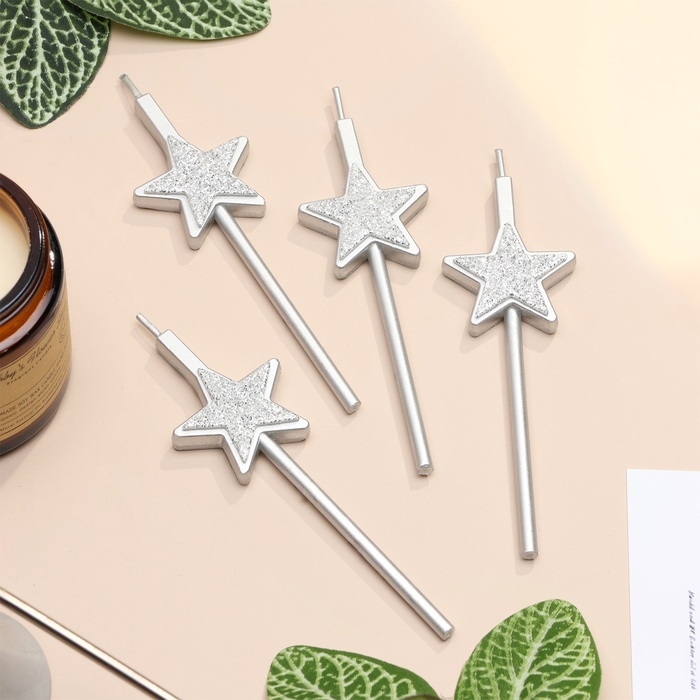 Набор свечей для торта, 4 шт "Блестящие звезды", серебряные