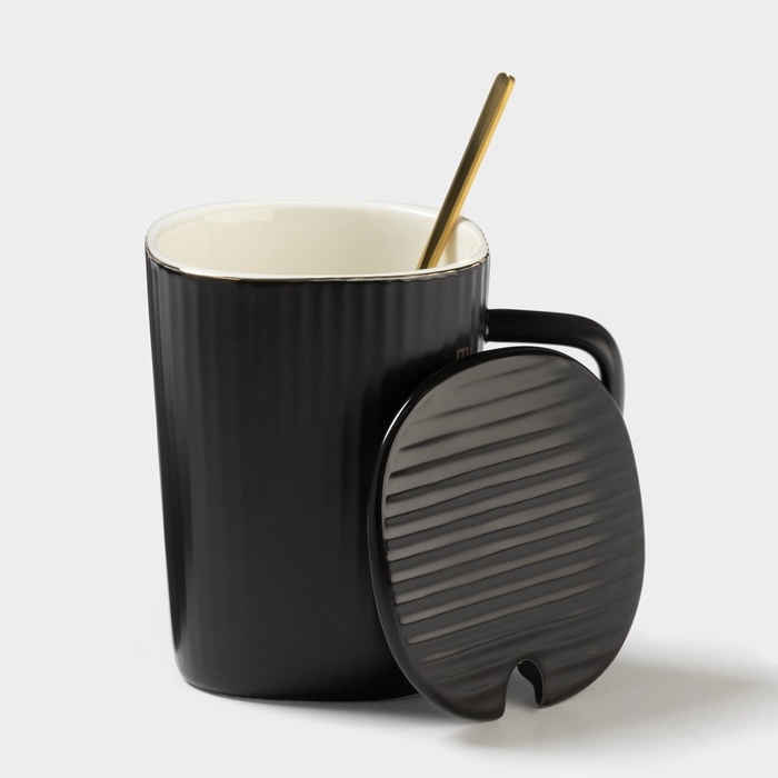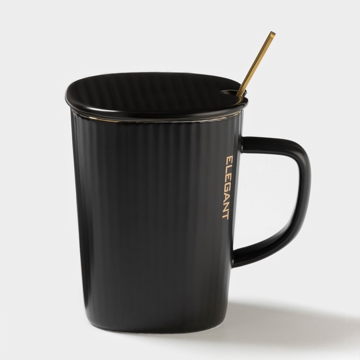 Кружка Elegant, 320 мл, 11,5×8×10,5 см, с крышкой и ложкой, керамика, чёрная