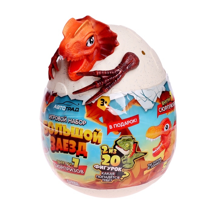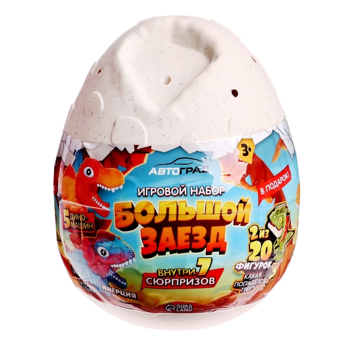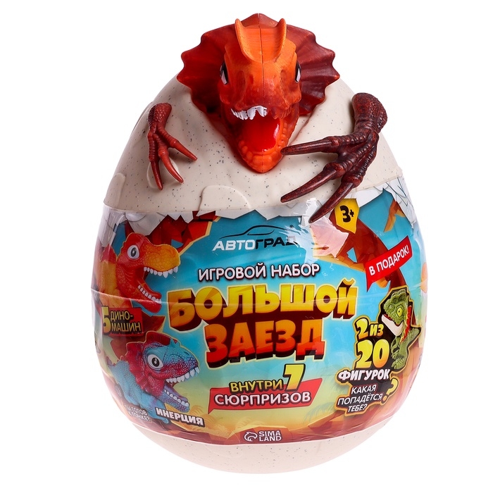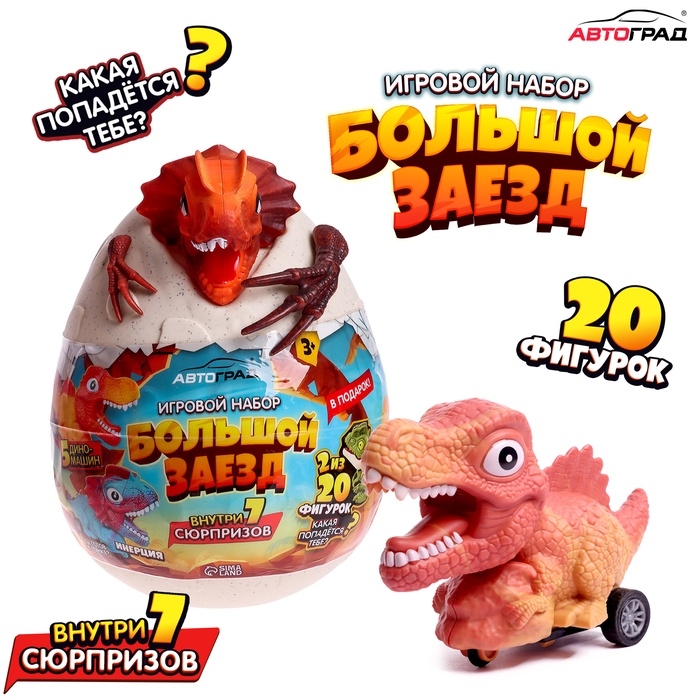 Яйцо-сюрприз «Большой заезд» — это увлекательный набор, который станет настоящим сокровищем для маленьких фанатов машинок и динозавров! Внутри этого яйца скрывается целых 7 сюрпризов: 6 ярких машинок и одна фигурка-динозавр.