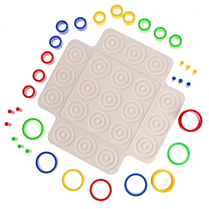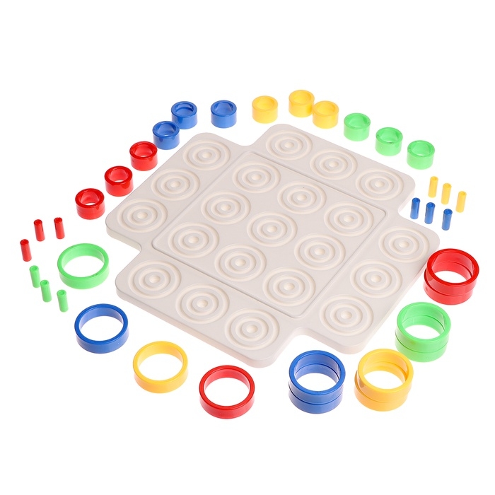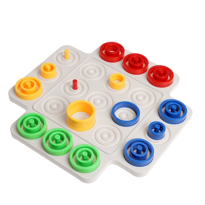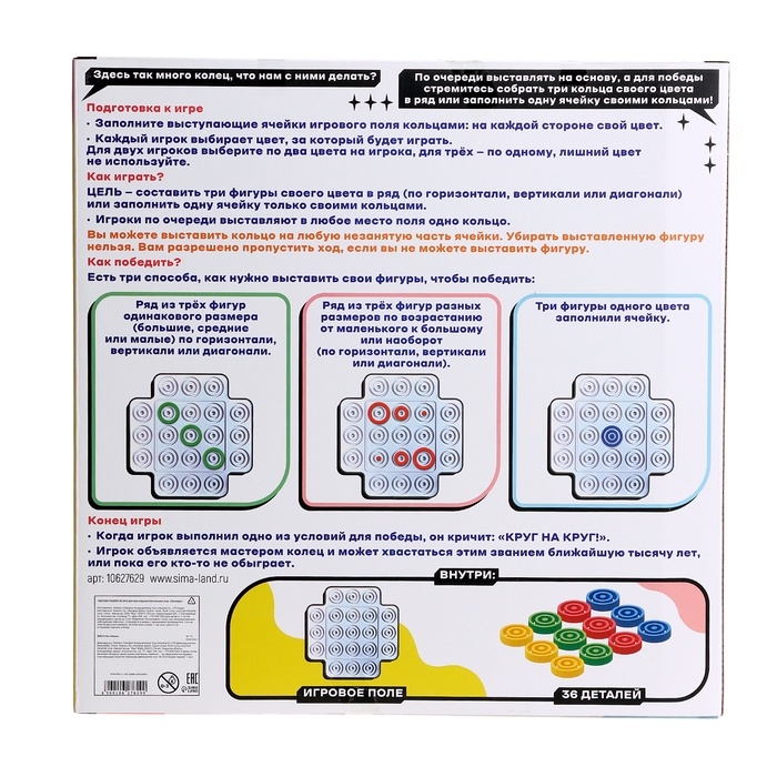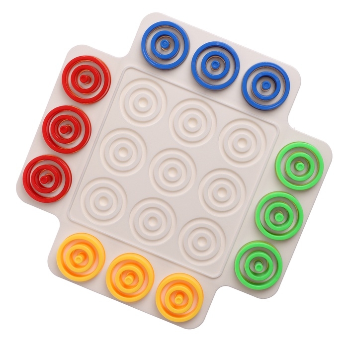 «Логикруг» — настольная игра для детей от 5 лет. Захватывающая настолка с яркими элементами предназначена для веселой тренировки на логику и увлекательного времяпровождения. Задача ребёнка — составить три фигуры своего цвета по горизонтали, вертикали или диагонали или заполнить одну ячейку только своими кольцами.