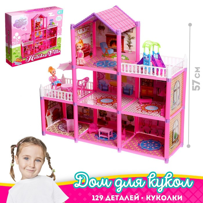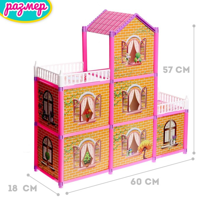 Размер домика: 60 × 18 × 57 см. Подходит для кукол высотой до 15 см. Мебель входит в комплект.