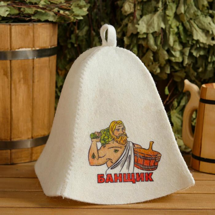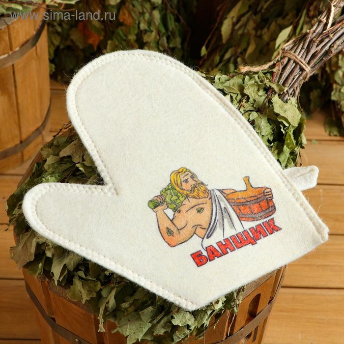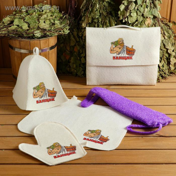 Набор для бани "Банщик" 5 в 1 (сумка,шапка,варежка,коврик,мочалка) с принтом, белый
