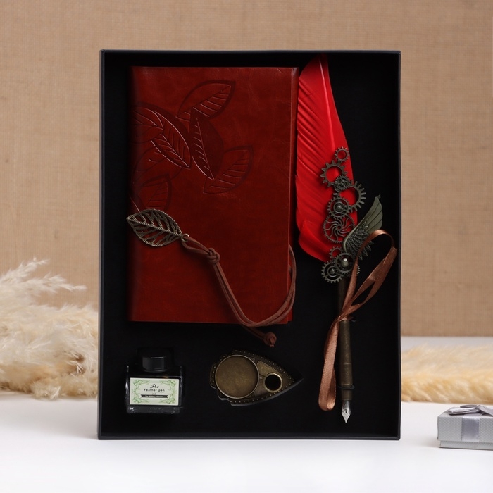 Набор подарочный 4в1 "Стимпанк": блокнот, перьевая ручка красная, чернила, наконечники