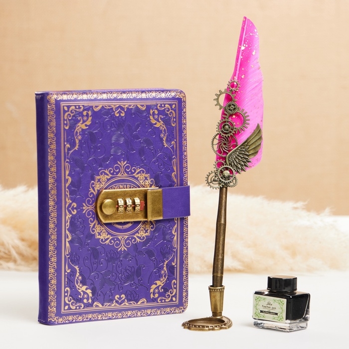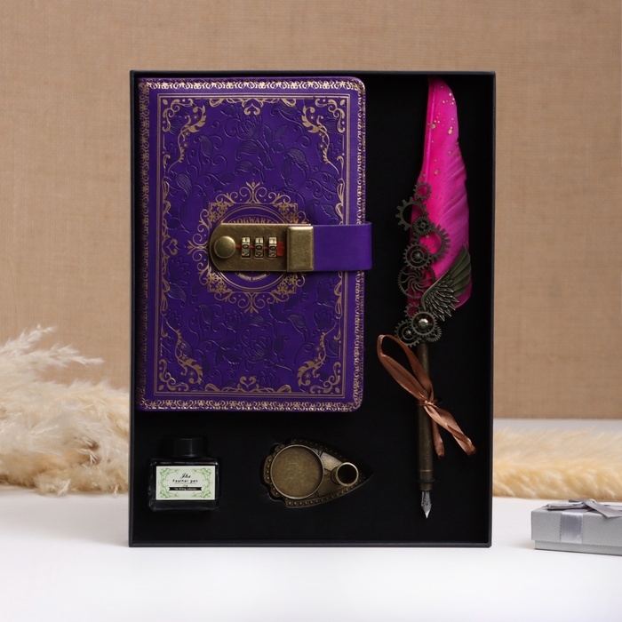 Набор подарочный 4в1 "Стимпанк": блокнот, перьевая ручка фиолетовая, чернила, наконечники