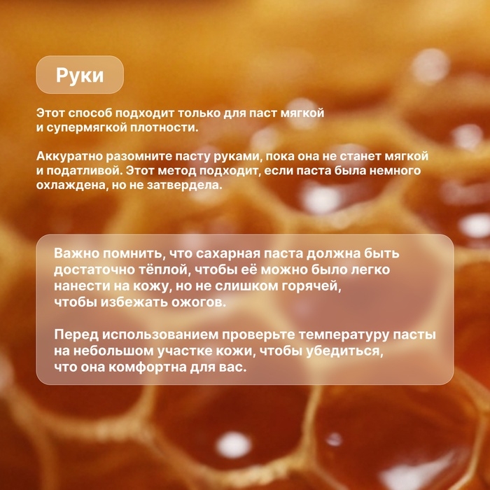 - Возьмите необходимое количество сахарной пасты и разогрейте её в микроволновке, проверяя каждые 5 - 10 секунд или на водяной бане до комфортной температуры. Паста должна быть достаточно мягкой, но не слишком горячей, чтобы не обжечь кожу.