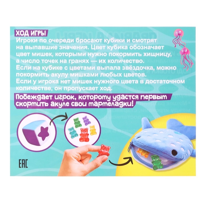 - Побеждает игрок, которому удастся первым скормить акуле всех своих мармеладных мишек.