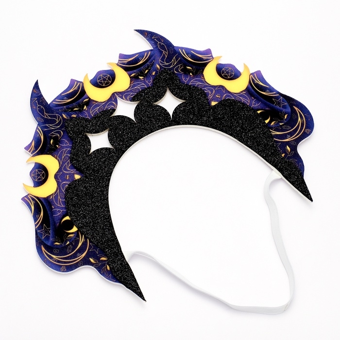 Кокошник «Тёмный» — изысканный головной убор, который перенесёт вас в таинственный мир готики. Кокошник выполнен из фетра высокого качества и украшен блестящими элементами, которые придают ему особый шарм. Мягкая резинка обеспечивает комфортную посадку на голове.