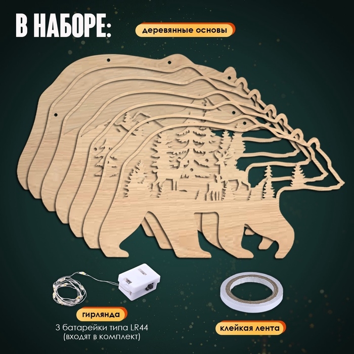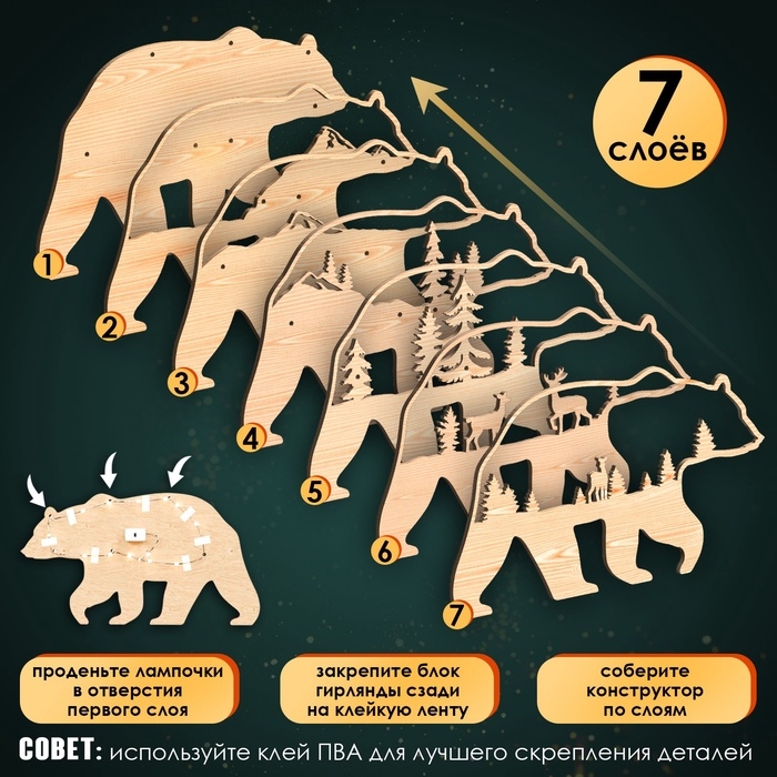 Деревянный конструктор «Медведь», размер 12х23 см, гирлянда в комплекте