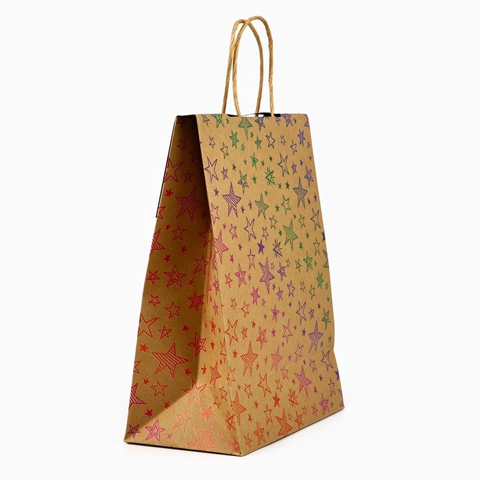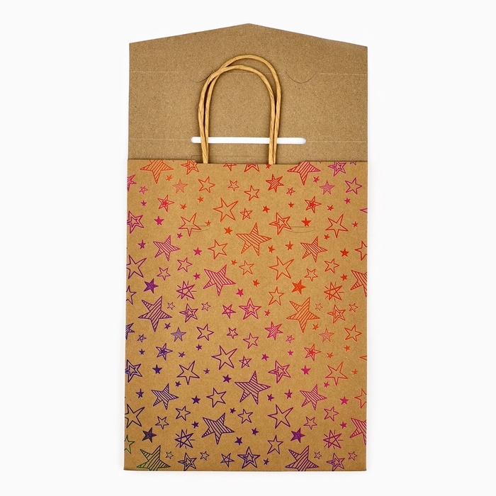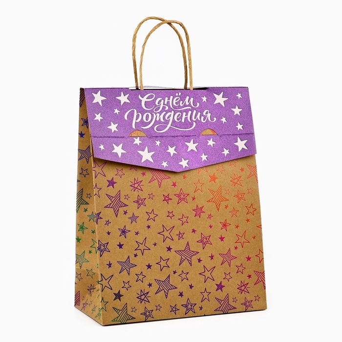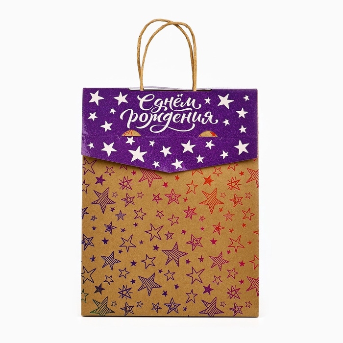 Пакет с клапаном «С Днём рождения», звезды, крафт, глиттер, 19,5 × 10 × 25.2 см