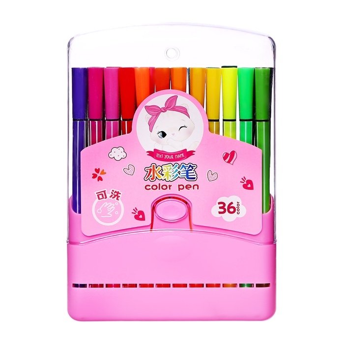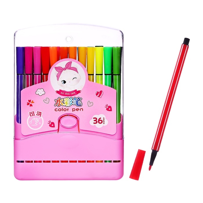 Фломастеры 36 цветов Полоска в пластиковом пенале вентилируемый колпачок, розовый