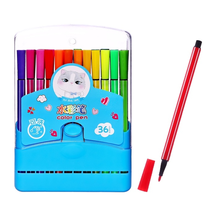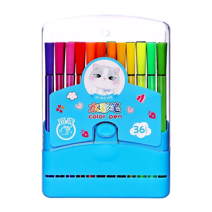 Фломастеры 36 цветов Полоска в пластиковом пенале вентилируемый колпачок, голубой