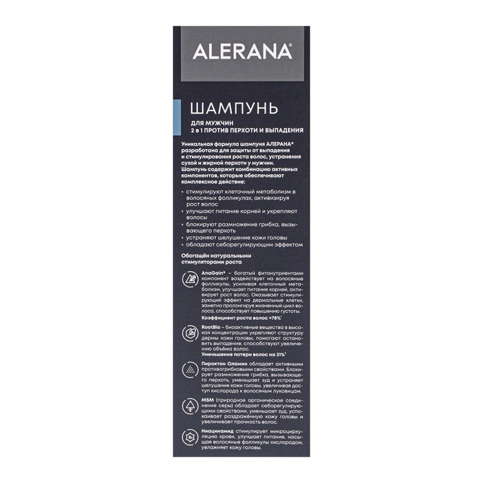 Шампунь для волос мужской Alerana — это уникальное средство для активации роста волос, разработанное специально для мужчин. Благодаря своей уникальной формуле, обогащённой активными компонентами, такими как масло чайного дерева, экстракт шалфея, масло розмарина, экстракты женьшеня и каштана, а также ниацинамид, этот шампунь эффективно укрепляет корни волос, питает кожу головы, предотвращает выпадение волос и стимулирует их рост.