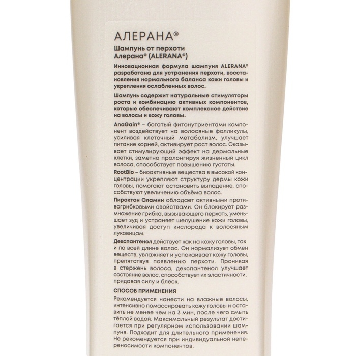 Шампунь содержит активные компоненты, такие как противогрибковое средство, компоненты для успокоения раздражённой кожи головы и натуральные стимуляторы роста волос с доказанной эффективностью. Регулярное применение шампуня «Алерана» позволяет достичь максимального результата и поддерживать здоровье волос и кожи головы на протяжении длительного времени.