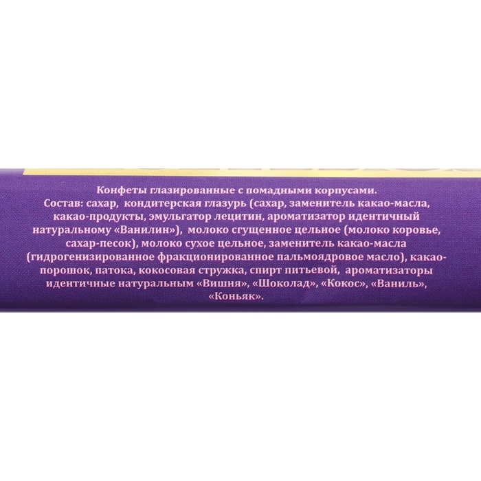 Состав: сахар, кондитерская глазурь (сахар, заменитель какао-масла, какао-продукты, эмульгатор лецитин, ароматизатор идентичный натуральному «Ванилин»), молоко сгущённое цельное (молоко коровье, сахар-песок), молоко сухое цельное, заменитель какао-масла (гидрогенизированное фракционированное пальмоядровое масло), какао-порошок, патока, кокосовая стружка, спирт питьевой, ароматизаторы идентичные натуральным «вишня», «шоколад», «кокос», «ваниль», «коньяк».