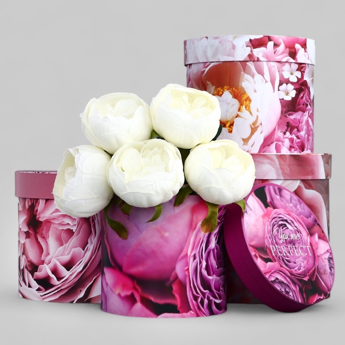 Набор шляпных коробок для цветов 4 в 1, упаковка подарочная, «Пионы», 20 х 17,5 - 16 х 14 см