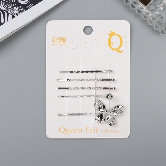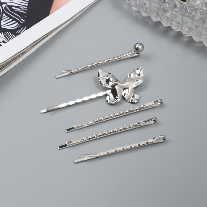 Невидимка для волос "Бенте" (набор 5 шт) бабочка, 5 и 6 см, серебро